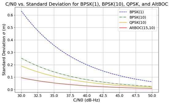 Pseudorange noises for BPSK, QPSK, and AltBOC signals.