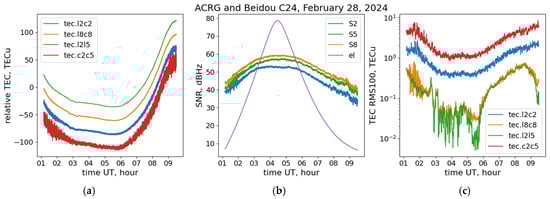 This section presents examples of case studies of the single-frequency TEC estimation and TEC noises obtained with the Galileo and BeiDou AltBOC signals on 28 February 2024 at the ACRG receiver, as well as the whole statistics of the TEC noises at this station during the entire studied period. Figure 3b shows the SNR of different signal components from the BeiDou C24 satellite at the ACRG station. It is obvious that all three observables demonstrate similar behavior with an increasing SNR with the increasing satellite elevation angle (also shown in the panel). At the same time, the SNR S8 for the B2(a+b) AltBOC signal is greater than the SNR S2 for the B1I BPSK(2) signal by ~7.5 dB-Hz, and by ~2.5 dB-Hz than the SNR S5 for the QPSK(10) B2a signal throughout the whole pass.