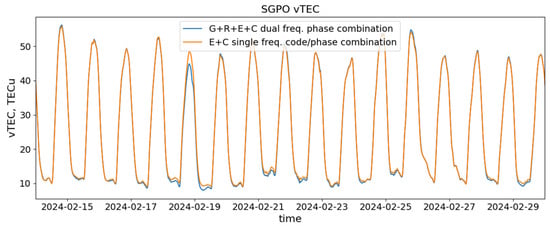 To ensure positive vTEC values, we use least squares with constraints implemented by solving the corresponding liner complementarity problem (LCP) as described in [10]. The program realization of this algorithm is publicly available via GitHub [34]. In the next section, we will also consider the possibility of estimating the single-station absolute vTEC based on the single-frequency phase/code combination (1) for AltBOC signals by applying the algorithm described above.