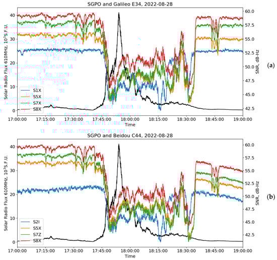 Signal-to-noise ratio (SNR) from the Galileo E34 (a) and BeiDou C44 (b) satellites observed at the SGPO station on 28 August 2022, alongside the corresponding solar radio flux at 610 MHz (black curves). In panel (a), the red line shows the SNR S8X of E5(a+b) signal, the green line represents the SNR S7X of E5b sideband, the orange line—SNR S5X of E5a sideband, and the blue line—the SNR S1X of E1 signal; and, in panel (b), the red line shows the SNR S8X of B2(a+b) signal, the green line—the SNR S7Z of B2b sideband, the orange line—SNR S5X of B2a sideband, and the blue line—the SNR S2I of B1I signal.