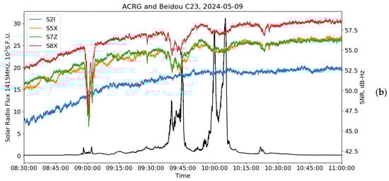 Signal-to-noise ratio (SNR) from the Galileo E10 (a) and BeiDou C23 (b) satellites observed at the ACRG station on 9 May 2024, alongside the corresponding solar radio flux at 1415 MHz (black curves). In panel (a), the red line shows the SNR S8X of E5(a+b) signal, the green line—the SNR S7X of E5b sideband, the orange line—SNR S5X of E5a sideband, and the blue line—the SNR S1X of E1 signal; and, in panel (b), the red line shows the SNR S8X of B2(a+b) signal, the green line—the SNR S7Z of B2b sideband, the orange line—SNR S5X of B2a sideband, and the blue line—the SNR S2I of B1I signal.