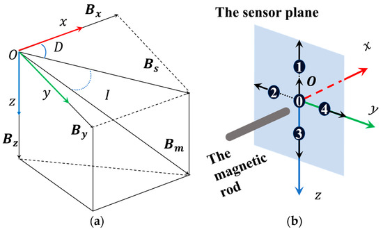 To discuss the BWMV sensor, it is necessary to define the basic concepts of the geomagnetic field. For any position on the Earth, there exists a geomagnetic field vector, which can be defined as , as shown in Figure 1a. We establish a Cartesian coordinate system that coincides with the geographic coordinate system to analyze the geomagnetic field vector, where the positive directions of the x-axis, y-axis, and z-axis correspond to geographic north, geographic east, and perpendicular downward, respectively. Therefore, , , and are the projections of on the three coordinate axes, respectively. In addition, the projection of on the horizontal plane is defined as , and the mutual relationship between geomagnetic components can also be represented by angles. The angle between and is defined as the magnetic declination , which is positive in a clockwise direction. The angle between and is defined as the magnetic inclination , which is positive when oriented downward along the horizontal plane.