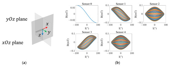 With a fixed total magnetic flux density of = 0.05 mT, parameterized scans were performed on the finite element model by changing the magnetic declination and magnetic inclination , where = (−180, 180°), = (−90, 90°), and the step sizes are 5°. The results are shown in Figure 2b, in which each curve represents the variation in the magnetic flux density of the sensor with the magnetic inclination while maintaining the magnetic declination constant. For sensor 0, all curves are identical, indicating that the measured value of the sensor is independent of . However, the simulated measured values of sensors 1 to 4 vary with and , indicating that the simulated magnetic field measurements at these points can effectively reflect the changes in the magnetic field angle.