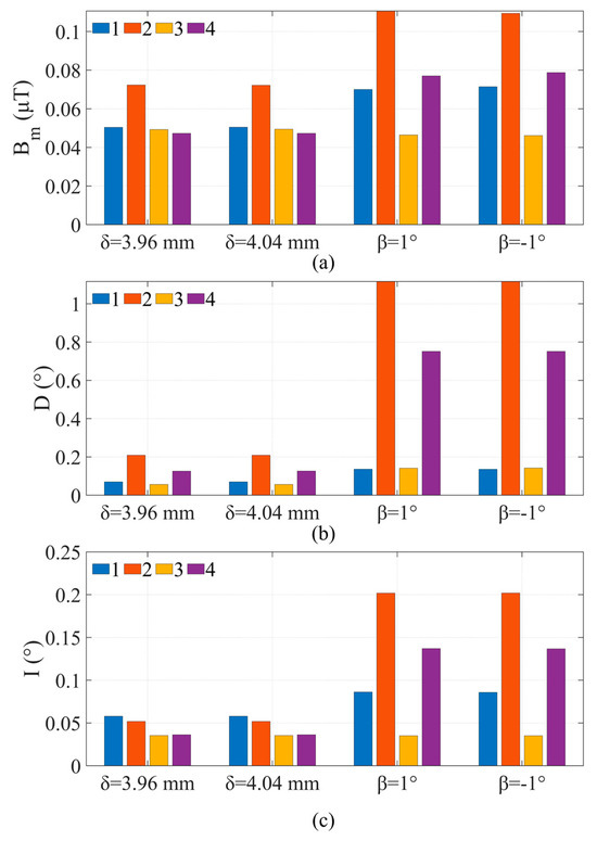 Regarding the remaining four sensors, the research method entails alternating the movement of a single point while maintaining the optimal positioning of the remaining points. The result is illustrated in Figure 3. The influence of installation errors on the total magnetic induction intensity is relatively minimal. For the magnetic declination , the RMSEs resulting from installation errors of sensors 1 and 3 are within 0.2°, while the impact of angular rotation of sensors 2 and 4 is significant. In the case of = ±1°, the RMSE can exceed 1°, which is far higher than the impact of sensors 1 and 3 under the same conditions. For magnetic inclination , the RMSEs caused by sensor installation errors are within 0.25°. In addition, due to the larger RMSEs of the magnetic field parameters caused by the position and angle errors of sensor 2 compared to other sensors, it is speculated that there may be a higher correlation weight for sensor 2 in the neural network, which makes the inversion results of sensor 2 more sensitive to its errors.
