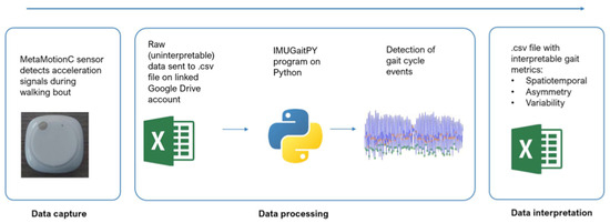 Data processing workflow. Flowchart describing the data processing workflow. The MetaMotionC detects raw acceleration, gyroscope, and magnetometer signals, which are interpreted by a Python script known as the IMUGaitPY 2.0 program. This script extracts spatiotemporal gait metrics from the raw data and outputs them as a .csv file. Asymmetry and variability metrics can also be computed. Figure adapted from Fonseka et al. (2024) [4].