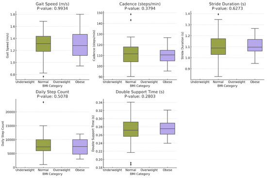 Our findings, which revealed no significant differences in cadence, gait speed, step length, daily step count, or double support time between normal and obese BMI categories, diverge from the existing literature reporting variations in gait dynamics associated with BMI differences [11]. For instance, in a study by Oltani et al. (2021) involving 2809 participants, increasing BMI was shown to be associated with decreased gait speed, and obesity significantly increased the likelihood of falls and related injuries [12]. This investigation into gait speed in relation to frailty and handgrip strength demonstrated that gait speed metrics significantly improved frailty detection and handgrip strength prediction, highlighting a strong link between BMI, gait dynamics, and physical function [13].