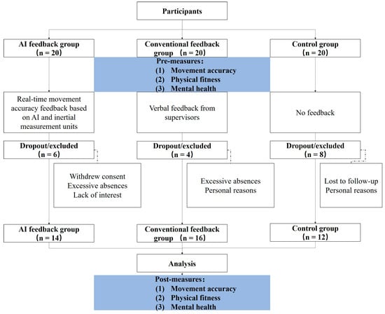 This study aimed to evaluate the impact of AI-based precise feedback tai chi on the physical and mental health of elderly individuals. Given the lack of comparable group parameters in the previous literature, G*Power (version 3.1.9.4) was used to estimate the required sample size. A medium effect size (ES = 0.30) was assumed, with a significance level of 0.05 and a desired power of 0.80 []. With three groups, the initial estimated sample size was 30 participants, with 10 participants per group. Considering a potential attrition rate of 30%, each group required 15 participants, totaling 45 participants. To further enhance the statistical power of the study, the sample size was increased to 20 participants per group, resulting in a total of 60 participants.