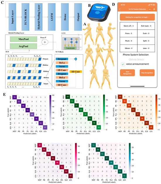Technological process for implementing AI feedback-based tai chi interventions; (A) the “Eight Techniques and Five Steps” (Taiji Bāfǎ Wǔbù); (B) IMU sensors for collecting motion data; (C) architecture of the TCN-LSTM neural network; (D) deployment of motion recognition algorithms on WeChat applets; (E) confusion matrix for five-fold cross-validation of models. Abbreviations: TCN: temporal convolutional neural network; LSTM: long- and short-term memory networks; 1D Conv: one-dimensional causal convolutional layer; WOF: ward-off; RB: roll-back; PR: press; PU: push; PLU: pluck; SPL: split; ELB: elbow; LEA: lean.