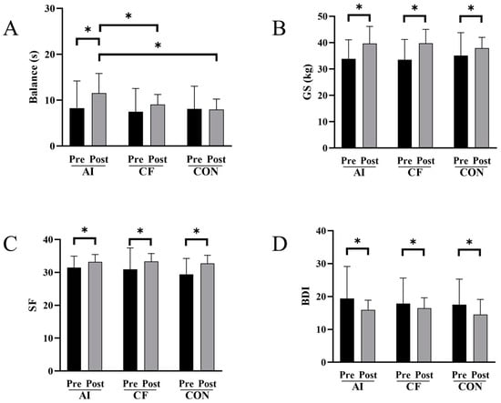 Fitness and mental health indicators before and after the intervention. (A) Balance; (B) grip strength; (C) SF-12; (D) BDI; Abbreviations: GS: grip strength; SF-12: 12-Item Short Form Survey; BDI: Beck Depression Inventory; AI: AI feedback group; CF: conventional feedback group; CON: control group. * indicates significant differences.