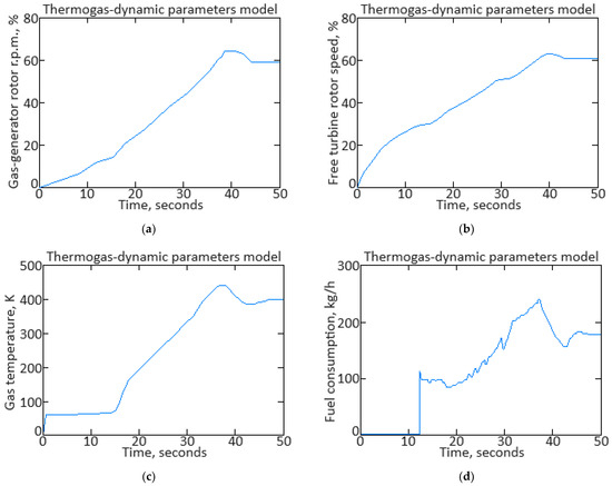 Diagrams of changes in the helicopter turboshaft engine parameters (using for example, the TV3-117 engine) at starting mode: (a) fuel consumption, (b) gas-generator rotor r.p.m., (c) free turbine rotor speed, (d) gas temperature in front of the compressor turbine (author’s research).