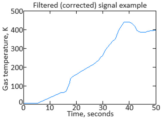 In addition to eliminating the registration system’s shortcomings, the original information, as a rule, requires high-frequency interference filtering from information and measuring channels. At the second stage of the identification procedure, low-pass filters are created. Practice shows that the most suitable filters for this purpose are filters with an infinite impulse response, for example, Butterworth filters. However, such filters have a significant phase shift of the filtered signal. To eliminate this, filtering must be performed twice: first in the forward direction, and then in the reverse direction [61]. Figure 2 shows the low-pass filtering result with an eighth-order Butterworth filter for the gas temperature in front of the compressor turbine parameter.