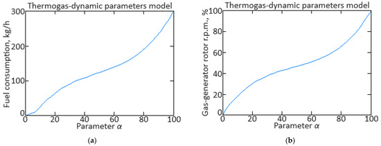 The dynamic model requirement being developed is as follows: along with dynamic processes, the model must reproduce stationary engine operating modes in the range from low throttle to emergency [62]. To take this requirement into account, we introduced the functional dependences of the helicopter TE parameters on mode parameter α, which will uniquely determine the point on the static mode line from idle mode to emergency mode: nTC(α), nFT(α), (α) и GT(α). These dependencies ensure the accurate modeling of both transient and steady-state behaviors across the entire operating spectrum.