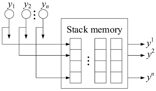 For the Elman network training, gradient methods are used, similar to conventional feedforward networks with certain modifications [76,77]. This allows the error function gradient to be correctly calculated using the backpropagation method in time, turning the recurrent network into a “regular” one. The gradient (changes in weights) calculating process consists of a forward pass (the layers state calculating), a backward pass (the layers error determining), and calculating the change in weights based on the data from the previous stages. The adaptive storage of past temporal events is made possible by adding a dynamic memory stack (Figure 5) to recurrent neural networks, which allows it to provide and create a flexible tool for developing nonlinear models [76]. The modified Elman neural network is obtained by adding a delay to the hidden layer feedback signals (i.e., adding to the dynamic stack memory layer).