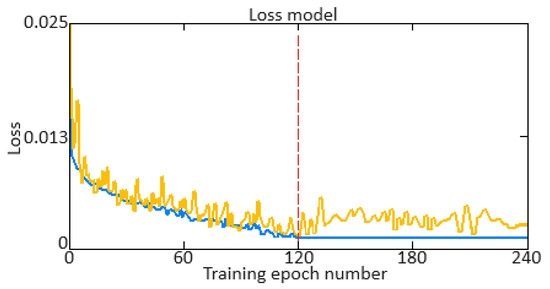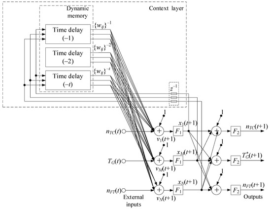 The hidden layer outputs, denoted as v1, v2, …, vN, are fed to the input neurons using weighting coefficients {wij}−z, where i is the neuron index sending the signal (i = 1, 2, …, t); j is the hidden layer neuron output signal index (j = 1, 2, …, k); z = 1 is the time delay index (for the Elman network). A detailed examination of the neural network (Figure 6) architecture showed that feedback from the hidden layer or from the network output could be neglected by including feedback signals in the training set.