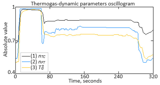 The parameters nTC(α), nFT(α), (α), and GT(α) are the helicopter TE corresponding parameter values obtained experimentally, depending on the mode parameter α. The mode parameter α is understood as a certain value that allows us to determine the “distance” from the combustion chamber ignition moment to the starting mode considered moment. In the simplest case, this may be the time that has passed since the fuel ignited.