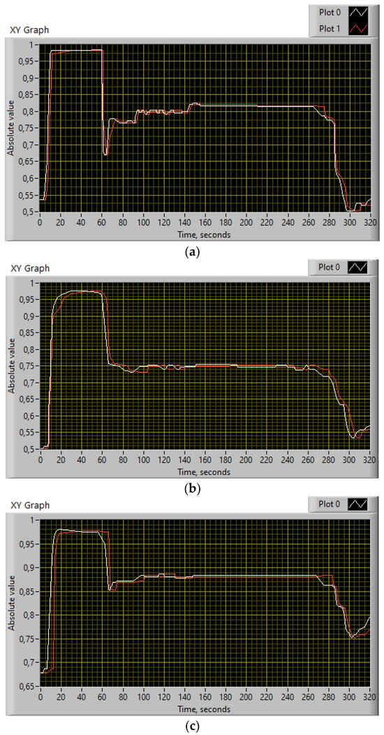 At the fifth stage, the linear vector-matrix equation coefficients forming model (2) are determined. For this purpose, an experimental data matrix A = [nTC, nFT, , GT] with dimensions (m × 4), where the value m is the discrete sample number in the given experimental data, is formed. Next, the coefficient vectors are formed that need to be determined: x1 = [a11, a12, a13], x2 = [a21, a22, a23], x3 = [a31, a32, a33]. After this, vectors are compiled from the rotation frequencies’ derivative values and the helicopter TE’s other parameter values , , . Three equations for overdetermined systems are compiled and solved:
