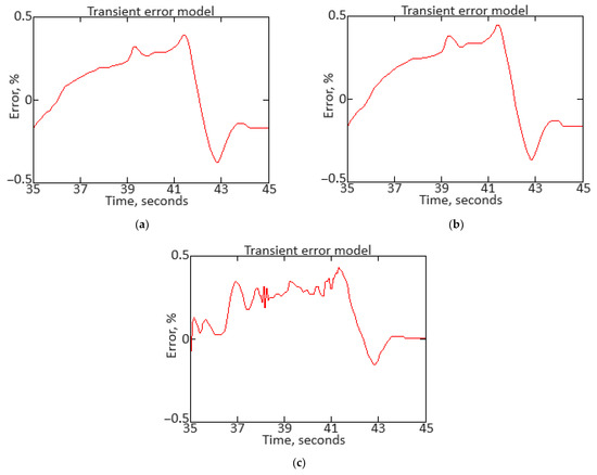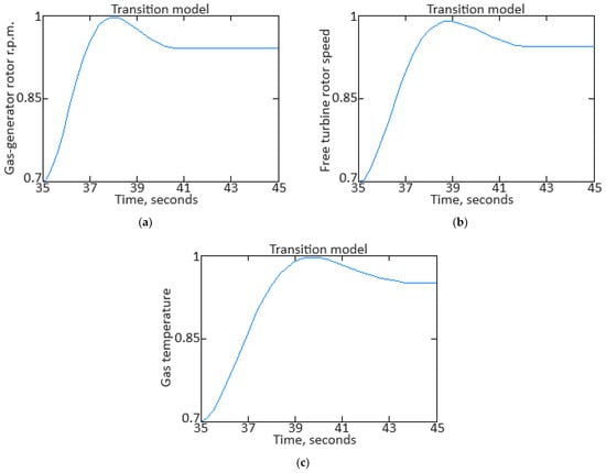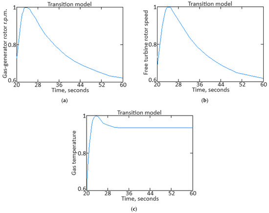 Therefore, at the sixth stage, a search is made for the coefficient values of the equations that are optimal for each value of the parameter in starting mode. For the differential equations from the coefficient values from Equation (4), the determining task is formulated as a quadratic programming task with objective function F(x1) to determine the differential equation coefficients based on the gas-generator rotor r.p.m., F(x2) to determine the differential equation coefficients based on the free turbine rotor speed, and F(x3) to determine the differential equation coefficients for the gas temperature in front of the compressor turbine: