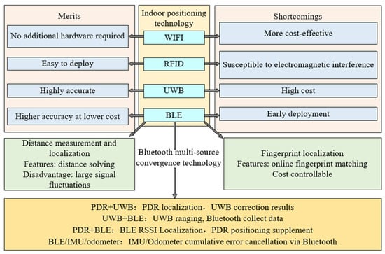 In contemporary society, indoor positioning technology has significantly enhanced the functionality and interactivity of various spaces such as indoor navigation [,]. The quintessence of this technology lies in its ability to provide precise location data within indoor environments, where traditional Global Positioning Systems (GPSs) falter due to signal attenuation and obstruction [,]. The devices for the indoor positioning include Wireless Fidelity (Wi-Fi), Radio Frequency Identification (RFID), Ultrasonic positioning systems, Inertial Navigation Systems (INS), UWB technology, and Bluetooth []. Figure 1 organizes the current state of research in indoor positioning in recent years.