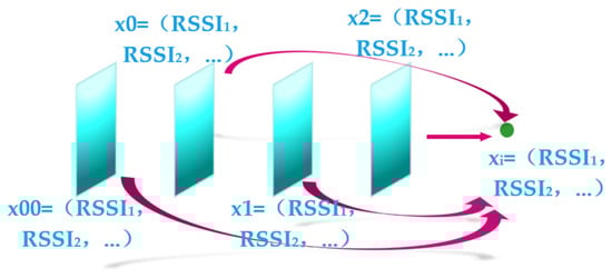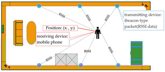 where RSSI denotes the received signal strength, n denotes the environmental attenuation factor, A indicates the signal strength at a distance of 1 m between the transmitter and receiver, d signifies the distance between the transmitter and receiver, and RSSIN specifies the received signal strength from the Nth access point AP.