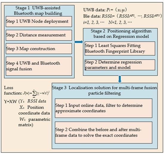 Utilizing UWB Bluetooth technology, an offline fingerprint database is established, which is subsequently integrated with a regression model and multi-Frame fusion particle filtering for real-time pedestrian localization, as illustrated in Figure 3.