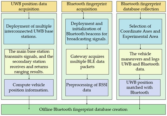 In the offline stage of Bluetooth fingerprint library localization, it is common to arrange multiple Bluetooth beacons in the area of interest and divide the area into grids. Points are then uniformly selected within the area, and their position co-ordinates and RSSI sequences are recorded to establish a comprehensive fingerprint library. To enhance the efficiency and accuracy of fingerprint data collection, this study incorporates UWB technology to assist in Bluetooth map building. A remote-controlled cart equipped with UWB and Bluetooth collection modules is used for automated data collection. This approach improves the efficiency of data collection without compromising positioning accuracy, the specific process is shown in Figure 4.