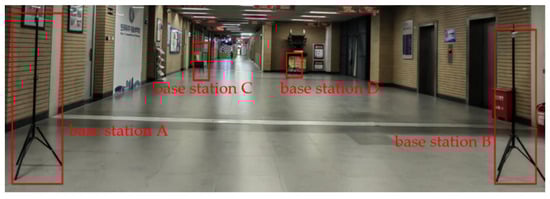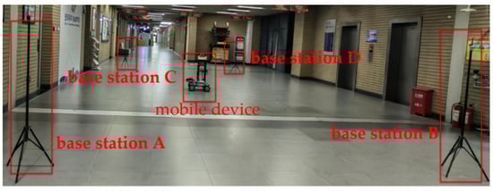 The UWB nodes are typically installed at fixed locations within a building to cover the entire area of interest for localization. The number and placement of these nodes are determined based on the building’s structure and positioning requirements, ensuring comprehensive coverage of the indoor area. Figure 5 illustrates the deployment, where the red rectangular boxes represent the UWB base stations. These base stations are arranged at the four corners of the area, allowing the targets within the area to receive signals transmitted by the base stations. The received signals are then processed and provided as feedback to the base stations themselves.