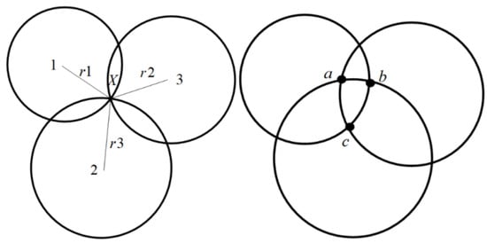 In this paper, the UWB localization experiment utilizes the trilateral ranging localization method. As depicted in Figure 6, the numbers 1, 2, and 3 represent three distinct UWB base stations involved in localization, while X represents the UWB tag. By employing the DS-TWR ranging method, the distances between the three base stations and the tag X can be measured. Subsequently, the distance equations of these three base stations can be solved to determine the location co-ordinates of the tag. The principle behind this method is illustrated in Figure 7. Geometrically, the three circles formed based on the ranging information and the ranging centers will intersect at a single point, which corresponds to the calculated location of the tag.