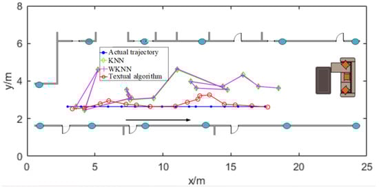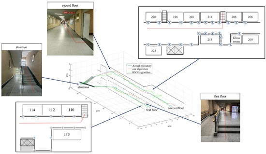 From the above figure, it can be seen that the trajectory obtained by the KNN/WKNN algorithm [,] is more chaotic and cannot reflect the user’s real trajectory. While the shape and contour of the trajectory obtained by the algorithm in this paper are more obvious and very close to the real trajectory.