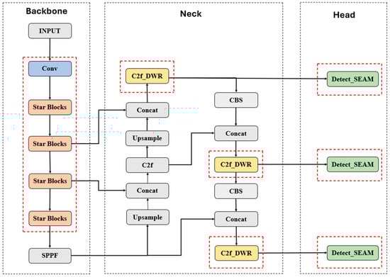 To tackle the challenges of detecting strip steel surface defects, we propose a detection network specifically designed for this purpose, based on YOLOv8, named YOLO-SDS. The suggested network architecture is highlighted in Figure 1. The model first replaces the backbone part of the YOLOv8 network with StarNet []. StarNet has high-dimensional feature processing capabilities and can map inputs to a high-dimensional nonlinear feature space through Star Operations without increasing the network width. This approach is similar to kernel methods but avoids actually increasing network complexity, thus achieving efficient data processing. Secondly, we introduce the DWR [] module combined with the C2f module of YOLOv8, expanding the receptive field without increasing computational complexity and maintaining the stability of network training. Finally, the traditional detection head (Detect) in YOLOv8 is replaced with Detect_SEAM [], enhancing feature representation, improving model performance, and increasing the model’s generalization ability.