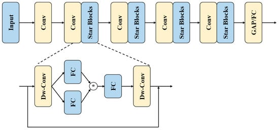 StarNet is an efficient neural network built around the core concept of the Star Operation, characterized by its simplicity and powerful performance. StarNet employs a layered network architecture, typically divided into four stages, with the number of feature channels gradually increasing at each stage. Each stage consists of a Convolutional Layer (Conv Layer) and a Star Operation Module (Star Block). The Conv Layer is responsible for down-sampling the input features (reducing resolution) while increasing the number of channels. The Star Operation Module includes a Depthwise Convolution Layer (DW-Conv), Fully Connected Layer (FC), activation function (ReLU6), and the Star Operation. The DW-Conv layer is used for independent convolution operations on each channel, maintaining spatial resolution. The FC layer maps the input features to different subspaces. ReLU6 introduces non-linearity, enhancing the model’s representational capacity. The Star Operation, as the core operation, fuses features from two branches through element-wise multiplication. The StarNet framework is illustrated in Figure 2.