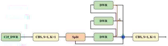 In the original YOLOv8, the C2f section contains multiple Bottlenecks. The Bottleneck structure primarily focuses on extracting local features. Although it is computationally efficient, it has certain limitations in capturing multi-scale contextual information. In contrast, the DWR module, by introducing various dilated convolutions and integrating multi-scale features, can more comprehensively capture contextual information at different scales. Therefore, we replaced the original C2f module with the C2f_DWR module to enhance the model’s capability for multi-scale feature extraction. The C2f_DWR structure diagram is shown in Figure 4.