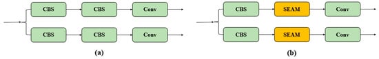 By integrating the SEAM module into the detection head of YOLOv8, the model’s ability to handle occluded objects is significantly improved, and the precision of feature extraction is optimized. Specifically, the occlusion-aware mechanism can actively identify areas in the image that are likely to be occluded, adjusting the network’s feature-capturing functionality process for these regions and allowing the network to better understand the details and characteristics of these complex areas. By enhancing the feature representation of these regions, the SEAM module effectively prevents information loss from occluded objects, ensuring that the model can more completely and accurately capture the entire target. The structure of the SEAM detection head is shown in Figure 6.