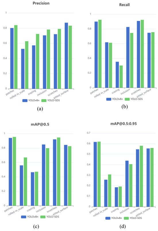 We also calculated the precision, recall, and mAP for the six types of strip steel surface defects in the detection results of YOLOv8n and YOLO-SDS and compared them. Subsequently, we plotted the rR curves for each type of defect, as shown in Figure 8 and Figure 9. In Figure 8 and Figure 9, it can be seen that our network shows improvements in precision, recall, and mAP for most categories of strip steel surface defects, and the overall mAP also increases. This demonstrates the superiority of our network in detecting strip steel surface defects.