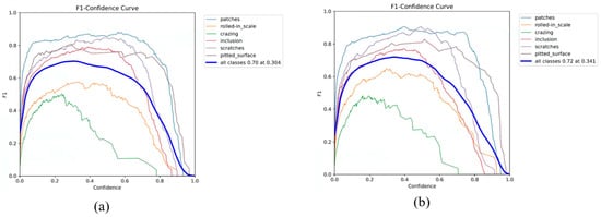 F1 score curve for different kinds of defects. (a) YOLOv8n and (b) YOLO-SDS.