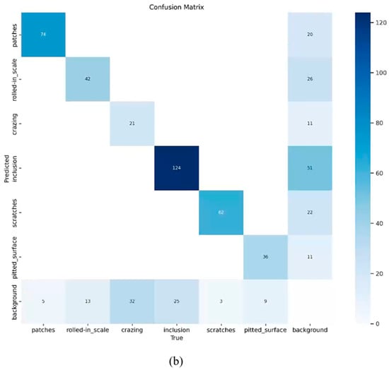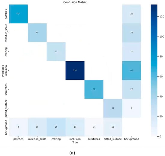 Additionally, we used a confusion matrix to further assess the detection capabilities of the trained model. Figure 11 presents the experimental results. As seen in Figure 11, the false positives (FPs) and false negatives (FNs) for most defect categories are comparable to or possibly surpass the original data, indicating that the enhanced model achieves greater accuracy of classification.
