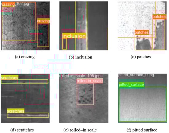 Surface defect detection has traditionally depended on manual visual inspection, a method that is both labor-intensive and time-consuming. This approach is inherently flawed because of the variability in individual skills and experience, which can lead to inconsistent results, including both misdetections and missed detections. However, the advent of machine vision technology has introduced more efficient and reliable alternatives. A major milestone in this transition was reached in 1983 when Honeywell in the United States developed a surface defect detection device utilizing charge-coupled device (CCD) technology []. Subsequently, various defect detection algorithms have been developed. For instance, Guo et al. [] introduced an edge detection algorithm that combines Kirsch and Canny operators, which has proven effective in detecting defects such as bubbles and pits on ceramic surfaces. Similarly, Nieniewski et al. [] developed a system based on morphological operations to extract features associated with orbital defects. However, traditional machine vision algorithms lack consistent robustness and generalization capabilities across diverse defect detection scenarios, making it difficult to meet the requirements of defect detection. With the development of deep learning, defect detection models based on deep learning have become a current research hotspot. Deep learning-based object detection algorithms are generally classified into two-stage and single-stage detection approaches. Two-stage algorithms include Faster R-CNN [] and Mask R-CNN [], while single-stage algorithms include YOLO [,,,,,], SSD [], and EfficientDet []. Among them, the application of YOLO in defect detection has been steadily growing because of its outstanding performance. While YOLO offers a quicker detection speed compared with two-stage algorithms, its detection accuracy still needs improvement when dealing with complex and diverse steel defects.