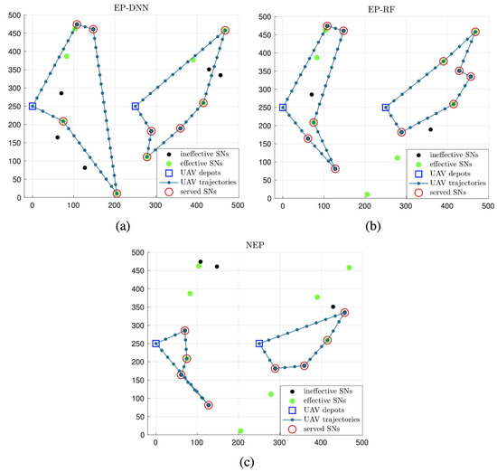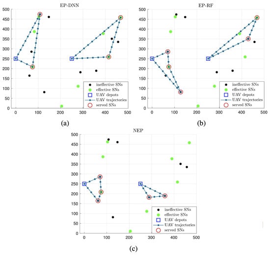 6.2. Illustrations of Optimized UAV Trajectories and SN Serve Scheduling