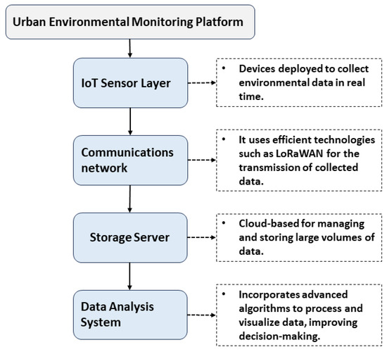 The sensor layer is responsible for collecting environmental data in real-time. These data are transmitted over a network that uses efficient technologies such as LoRaWAN [31,32]. The cloud-based storage server manages and stores large volumes of collected data. The data analysis system processes and interprets this information using advanced algorithms, which improves decision-making related to the urban environment.