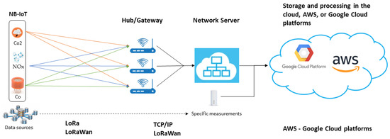 The infrastructure presented in Figure 2 is essential for the implemented urban environmental monitoring system, as it allows for efficient ecological data collection. The use of distributed IoT sensors and network technologies such as LoRaWAN and NB-IoT, along with data processing on cloud platforms such as AWS and Google Cloud, is critical to the accuracy and reliability of the results obtained from the system [46,47]. This configuration ensures that the analyzed data reflects urban environmental conditions in real-time, which is essential for the analyses’ validity.
