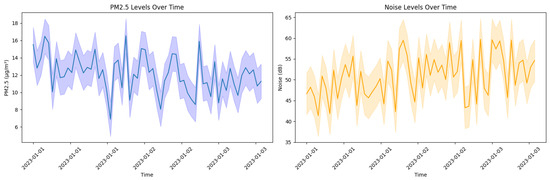 The results obtained from data analysis allow us to understand the current situation of the urban environment. A dynamic profile of the urban atmosphere has been built by monitoring key parameters such as air quality and noise. Figure 4 shows two graphs representing the temporal variations of two environmental variables of a city for 3 days, starting on 1 January 2023. The first graph shows the concentrations of PM2.5 particles in micrograms per cubic meter, with oscillations reflecting the air quality variability. The horizontal error bars in this graph indicate the precision of the measurements, providing a confidence interval that reflects the possible variation in PM2.5 values due to the inherent uncertainty in data collection. The second graph, which shows ambient noise levels in decibels, also includes error bars that represent the variability and reliability of these measurements. These error bars, calculated from the standard deviation of the collected data, allow us to appreciate the observed trends and evaluate the influence of possible disturbing factors or sporadic events in the urban environment. These graphs, with their corresponding error bars, provide an accurate and transparent representation of the data collected, essential for assessments of the city’s environmental health.