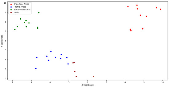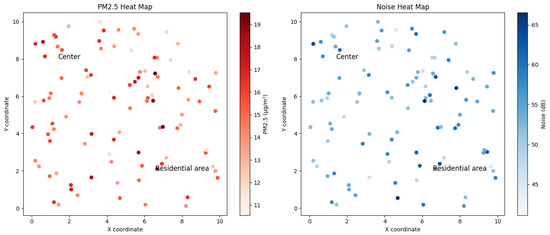 The study was conducted in a simulated city representative of a typical urban environment, with clearly defined residential, commercial, and industrial areas. To obtain a diverse and representative sample of environmental conditions, 150 IoT sensors were deployed in multiple strategic locations. Data from the sensors distributed in these areas were collected and analyzed over 6 months, providing data on air quality and noise levels. This approach allowed us to capture a detailed image of environmental patterns in a complex urban context.