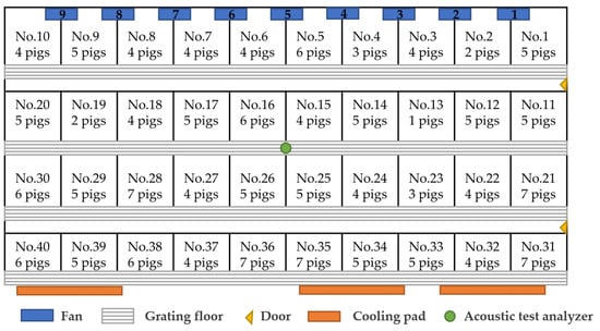 The study was conducted in Unit 04, Building 6, Shiwan Finishing Pig House of Zhejiang Huateng Animal Husbandry Co., Ltd. located in Tongxiang city of China from 20 October 2021 to 20 November 2021. The test objects were 189 Danish Landraces in the fattening stage. The plan schematic diagram of the pig house is shown in Figure 2.