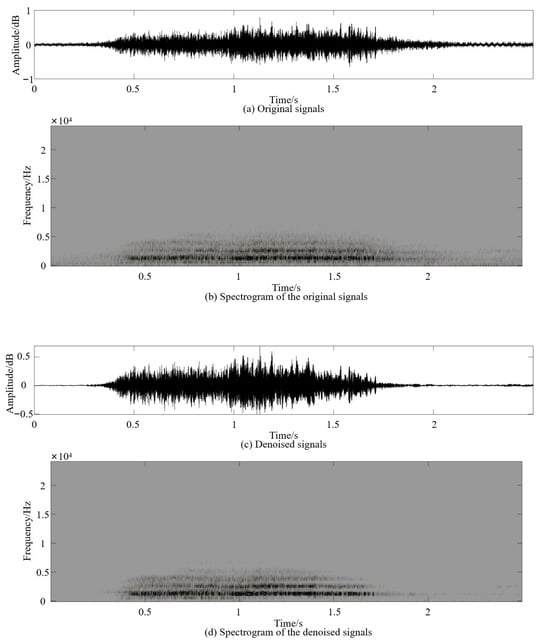 A subset of the vocal dataset Ai generated from 2 November 2021 to 6 November 2021 was selected and denoised using vocal processing software (Adobe Audition CC 2018, Adobe Systems Incorporated, CA, USA) and the adaptive noise reduction method [20]. In this process, the noise reduction amplitude was set to 20 dB, the noise amount was 80%, and the signal threshold was 3 dB. Thus, the pig vocal dataset Bi was obtained. Figure 3 shows a comparison of the effects before and after vocal data denoising in the pig barn. Noise was effectively eliminated and there was no noticeable distortion in the signals.