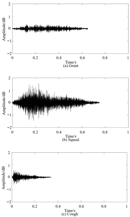 The pig vocal dataset Bi was syncopated using vocal processing software, with syllables and phonetic sequences as the units. The typical vocalizations of pigs in the large-scale breeding mode were counted using manual interpretation. A total of 939 clear and non-overlapping pig vocal clips Ci were obtained, including 291 grunts (30.99%), 357 squeals (38.02%), and 291 coughs (30.99%). The waveforms of the three types of pig vocalization are shown in Figure 4.
