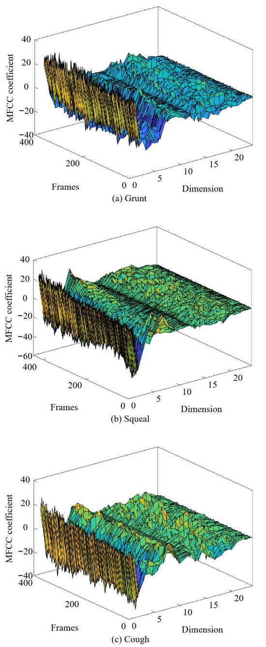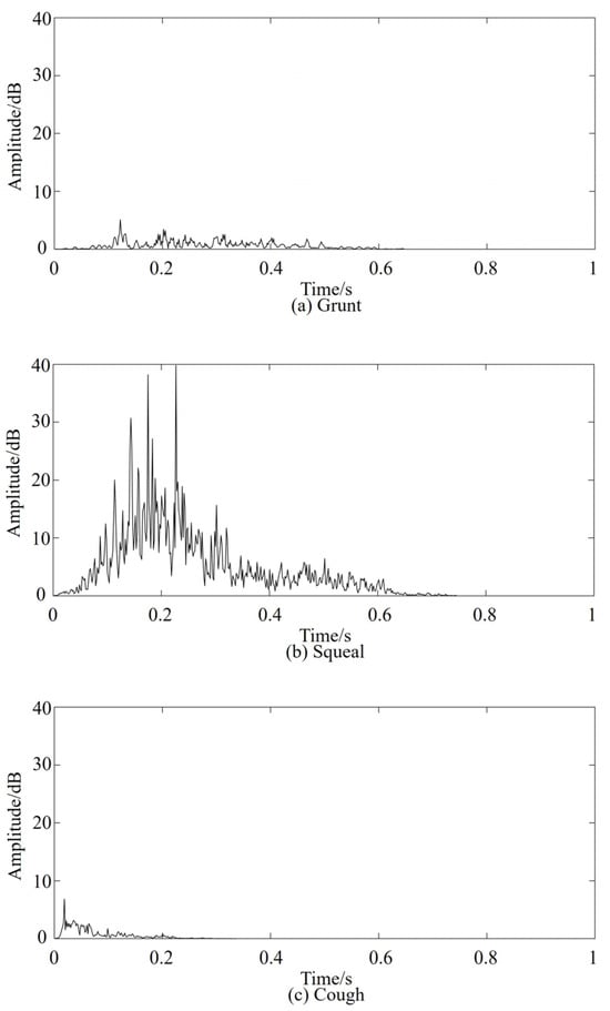 The STE of pig grunting, squealing, and coughing were calculated using vocal processing software. The features are shown in Figure 5.