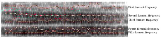 The formant frequency is a relatively concentrated area of energy in the vocal spectrum, which has a close relationship with the vocalization part and reflects the vocal quality features of the voice. The physical features of the vocal cavity can be inferred from the formant frequency parameters because the distribution ranges of the formant frequency parameters of different voices differ, and well distinguished different vocalizations [10]. Figure 6 shows the spectrogram of pig vocalization and reflects that there were obvious differences between different formant frequencies (from bottom to top, the first formant frequency, second formant frequency, third formant frequency, fourth formant frequency, and fifth formant frequency). The spectrogram reflected the initial examination of the data. Numerical data needed to be extracted to determine the differences between different vocalizations [10].