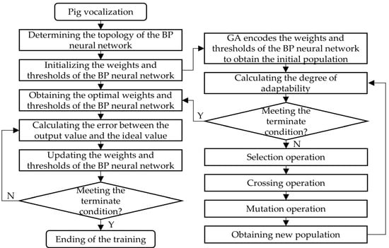 The BP neural network has been proved to be a useful way to classify abnormal pig sounds [24]. In this study, a typical three-layer BP neural network (input layer, hidden layer, and output layer) was selected to construct the pig vocalization classification model. The sigmoid function was used as the transfer function from the input layer to the hidden layer and from the hidden layer to the output layer. The number of nodes in the hidden layer was set to 10. The output layer was the recognition results of three types of vocal classification. The genetic algorithm was used to optimize the weights and thresholds of the neural network (GA-BP neural network) to improve the network training effect. Figure 8 shows the flow chart of the GA-BP neural network algorithm. As a result of the comparison of the effects of various group parameters on the recognition accuracy of the training set and validation set, the optimal value was selected. The number of training times was set to 1000, the target error was 0.00001, the learning rate was 0.01, the population size of the genetic algorithm was 50, the number of evolution times was 100, the crossover probability was 0.5, and the mutation probability was 0.01.