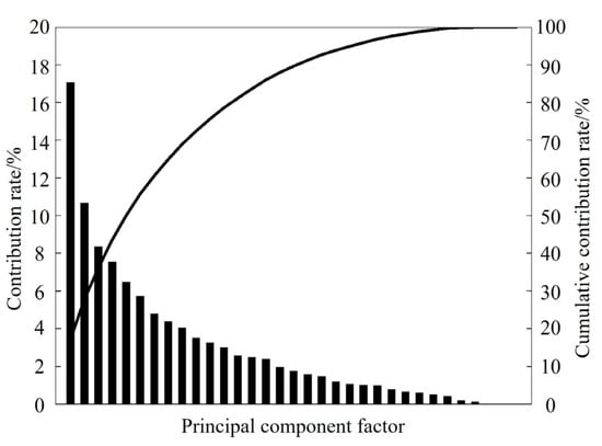 (4) The contribution rate and cumulative contribution rate of each component were calculated and the expression of the principal component was solved. The contribution rate Ci was equal to the ratio of eigenvalues λi corresponding to the principal component to the total eigenvalues, that is,