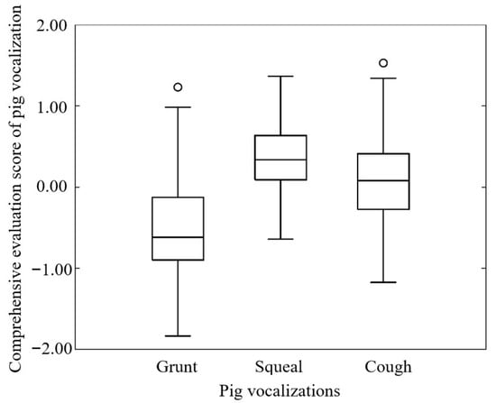 To better illustrate the differences between different types of pig vocalization, a box plot was drawn using the comprehensive evaluation scores of various vocal samples of pigs. As shown in Figure 10, the average comprehensive evaluation score of pig grunting was −0.52 and the distribution range of the comprehensive evaluation score was −1.07~0.03; the average comprehensive evaluation score of pig squealing was 0.35 and the distribution range of the comprehensive evaluation score was −0.03~0.73; the average comprehensive evaluation score of pig coughing was 0.08 and the distribution range of the comprehensive evaluation score was −0.42~0.58. There were significant differences in the comprehensive evaluation score of pig vocalization between the groups (p < 0.001), which indicated that the comprehensive evaluation score could be used as an effective indicator for the classification and recognition of various types of pig vocalization.