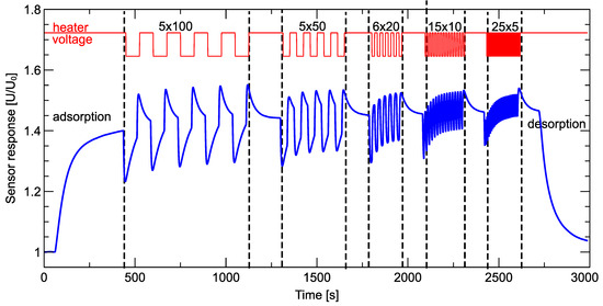 - We then performed the sensor heater voltage modulation cycles with steps of durations of 50, 20, 10, and 5 time units, which were repeated 5, 6, 15, and 26 times, respectively. The rectangular shape of these modulations with voltage levels of 5.0 and 4.5 V was used.
